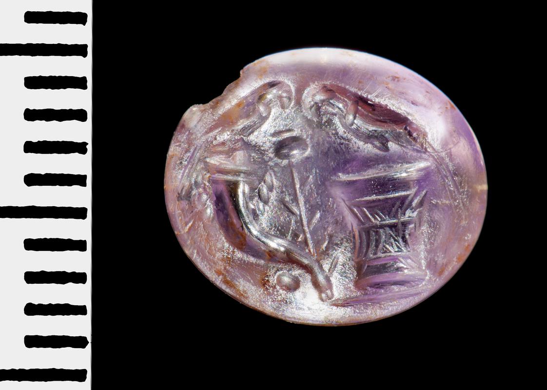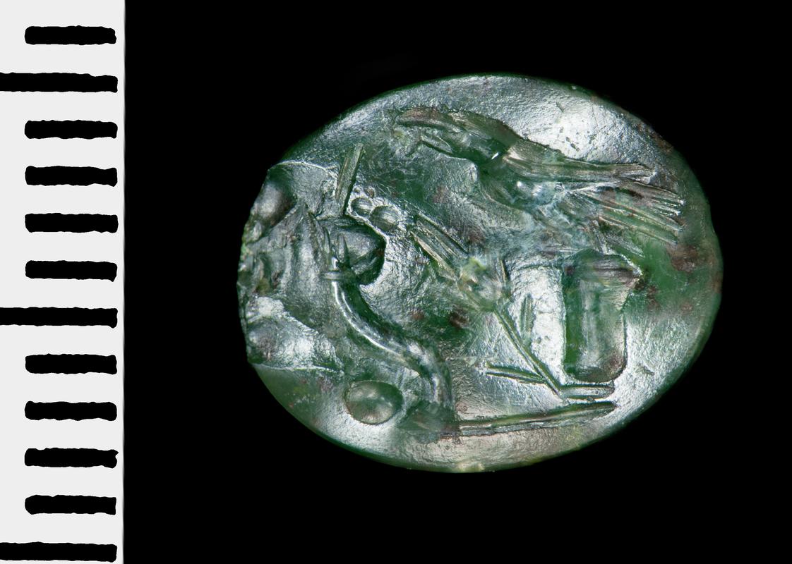 This is one of 88 engraved gemstones retrieved in 1979, mostly from the filling of a large drain beneath the cold hall of the fortress baths. The gemstones would originally have been set in finger-rings, and served as signets and charms or talismans for their owners. They were products of extremely skilled craftsman who worked on a minute scale without the aid of magnification. The gems are engraved with a wide range of deities, personification and symbols.