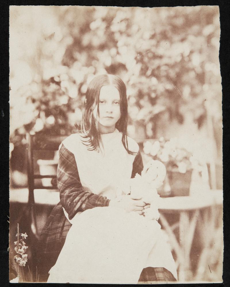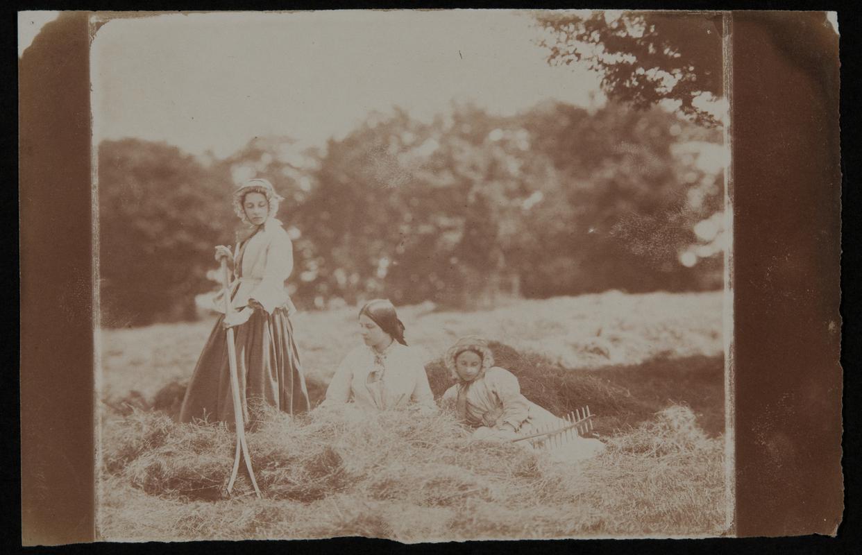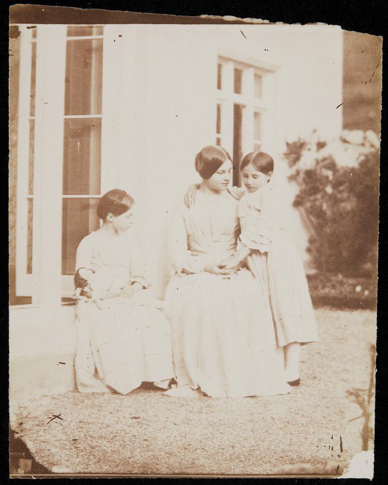 Salted paper print (from glass negative). Lucy and Elinor seated in identical costume, by a tree.