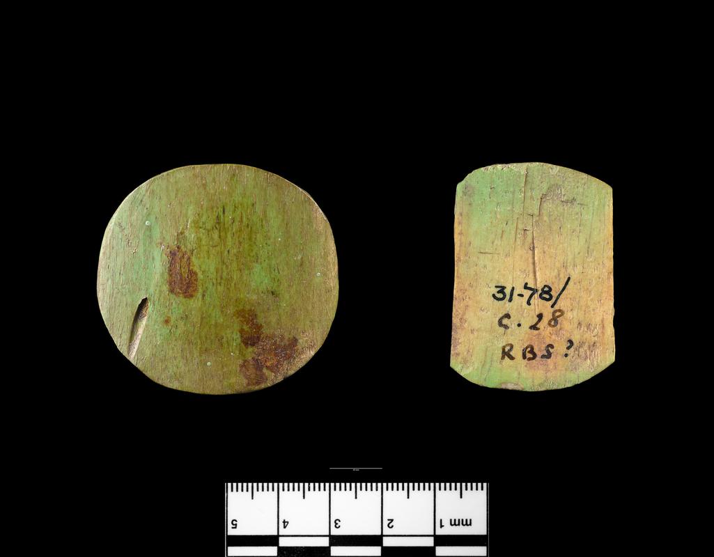 Back plate, originally decorated by a groove down each side, seven notches across the top and bevelling of the bottom edge, but broken on the line of one of the grooves.