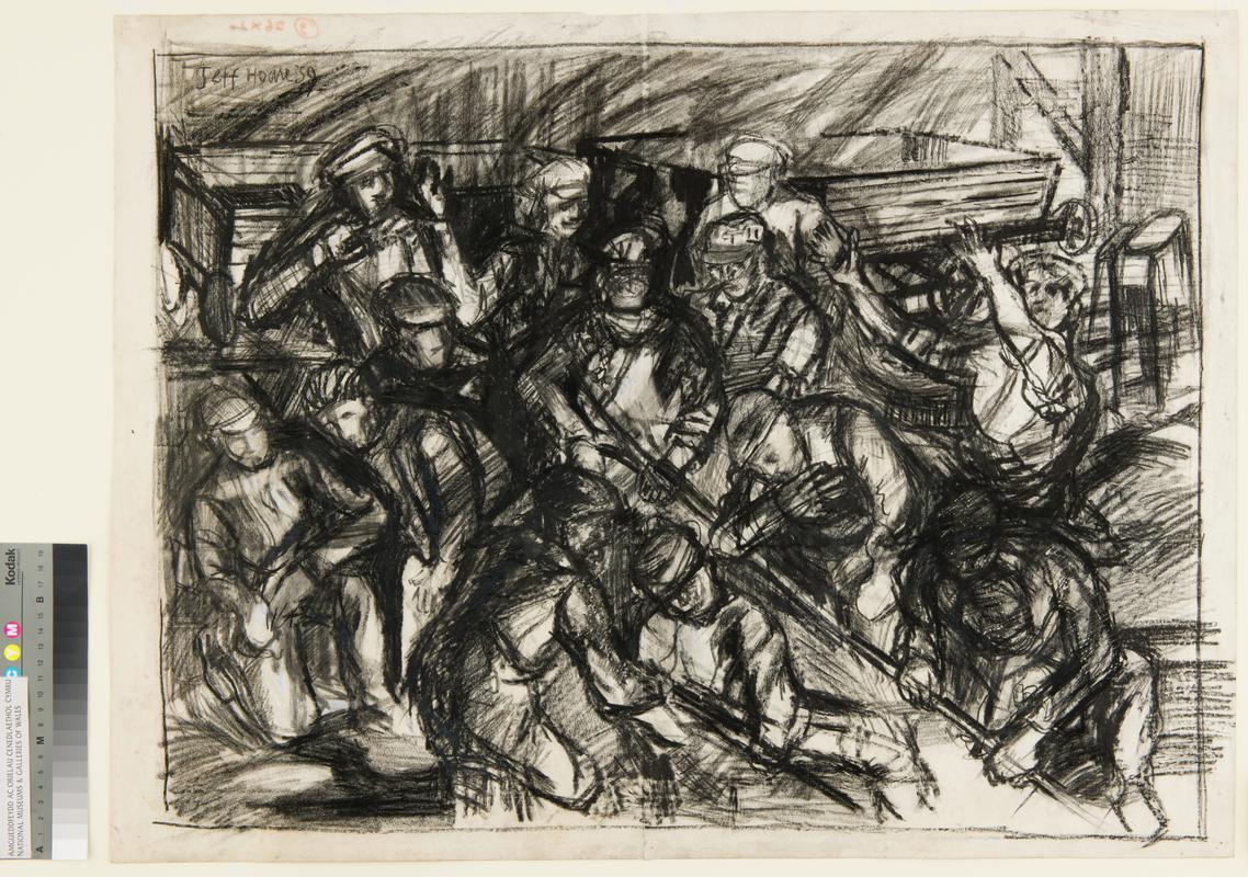 Preparatory pencil sketch/drawing showing the tapped iron flowing into channels in the casting house.