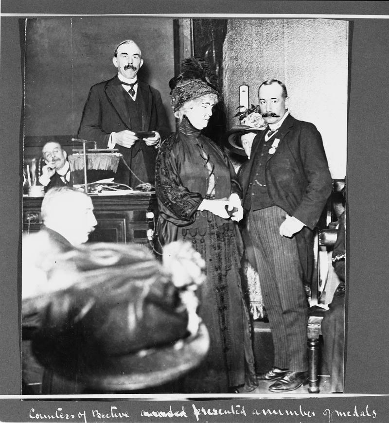 Black and white photograph. Full title - TV.R. Opening of the Tonypandy and Trealaw Station, Arrival of the First Passenger Train on Monday, March 9th, 1908.