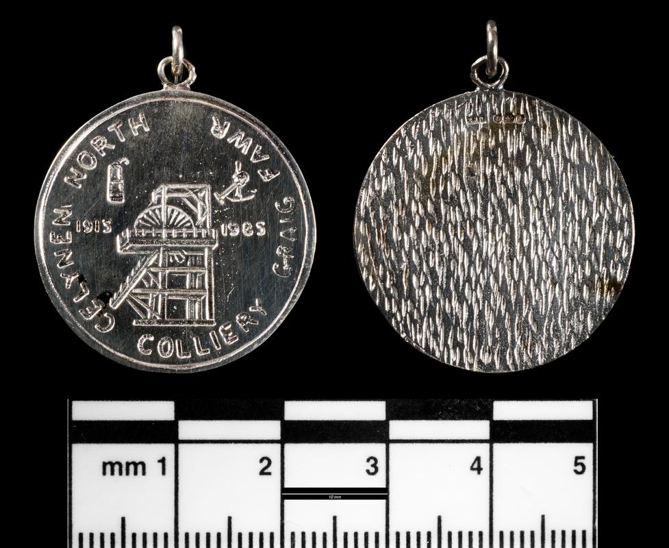 Gold metal medal with haunched figures of miners with head gear in background; one side shows 19th century miner carrying mandrel with miner's lamp, at feet, the other side shows modern day miner.