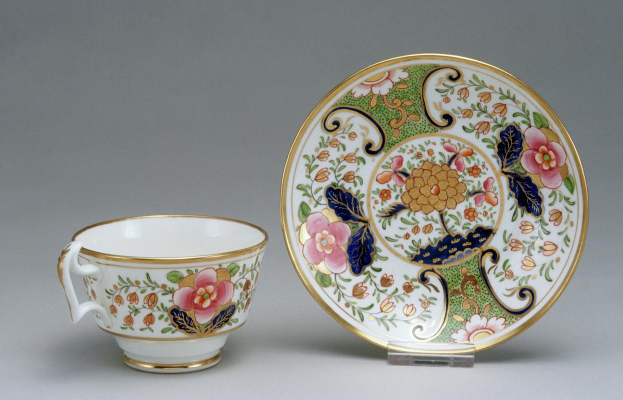 Cup and saucer, soft-paste porcelain, inverted bell-shaped cup with a high kidney-shaped handle, circular saucer with high sides, footring; the rims are decorated with gilt line borders and painted with pink roseheads on beds of gilt moss, the central reserve of the saucer is painted with one pink rosehead on a bed of gilt moss circled by a continuous border of leaves in gold, the bottom of the cup is painted with one pink rosehead on a bed of gilt moss and the exterior of the cup is banded with a continuous border of gold leaves.