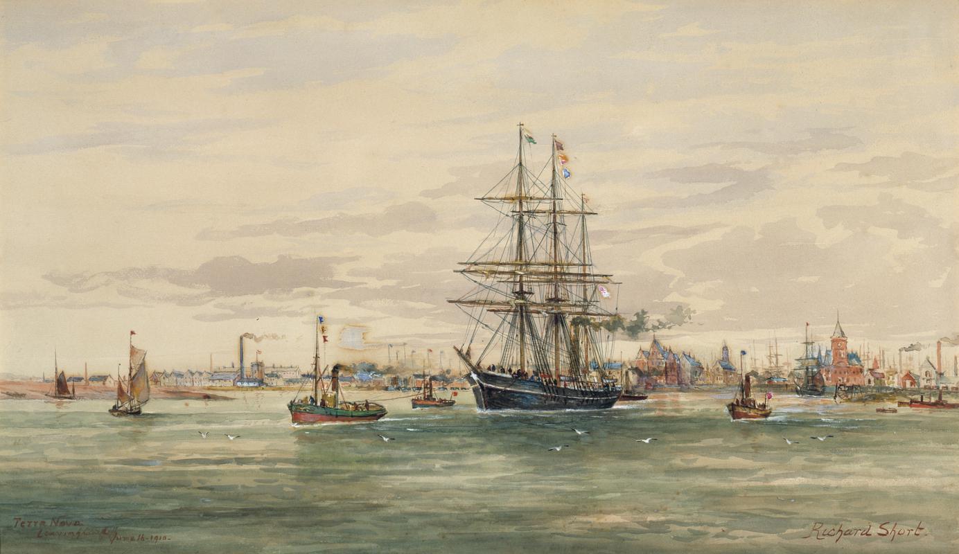 Portrait of the four-masted barque SPEEDONIA entering Sydney Heads, with North Head in the left background. Title painted bottom centre. Inscription bottom right. Signed and dated bottom left. Framed and glazed.