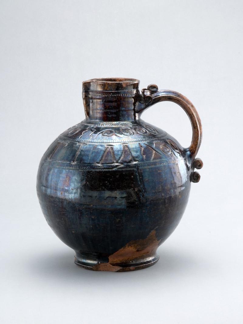 Large bulbous jug, well-made; decorated with tulip-type flowers and dots in white slip; large sunburst in white slip in front with sgraffito inscription 'Thomas Morgan Cardiff 1804'. Covered in yellow glaze giving a rich brown & yellow colour.