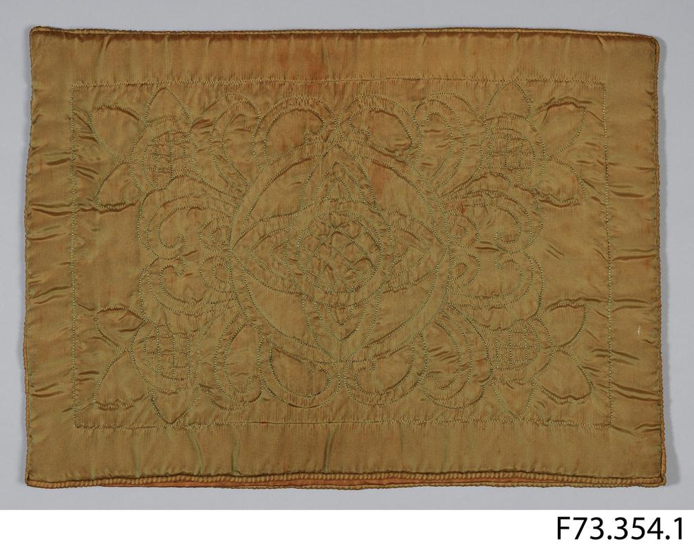 Pale pink nightdress case, 1930s. With deeper pink and pale blue pattern, lime green lining. Hand quilted with rose motif in a modified Italian quilting style.