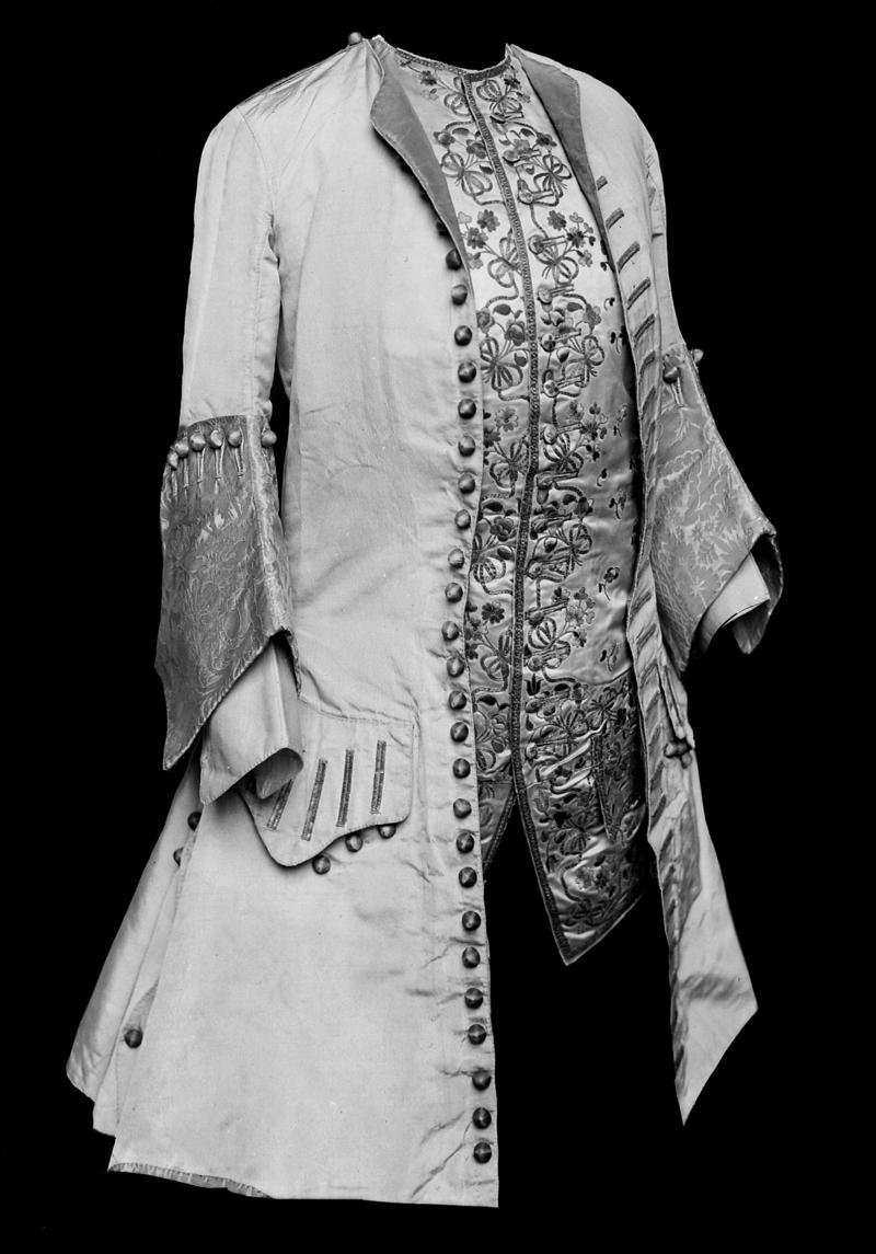 Mens collar less white cotton shirt. with 4 plastic buttons on the CF (one is missing) turnbacks at cuffs with cufflinks (the cover from right one is missing) 2 pleats on the CB. Fixing for collar on the front, black and white metal.