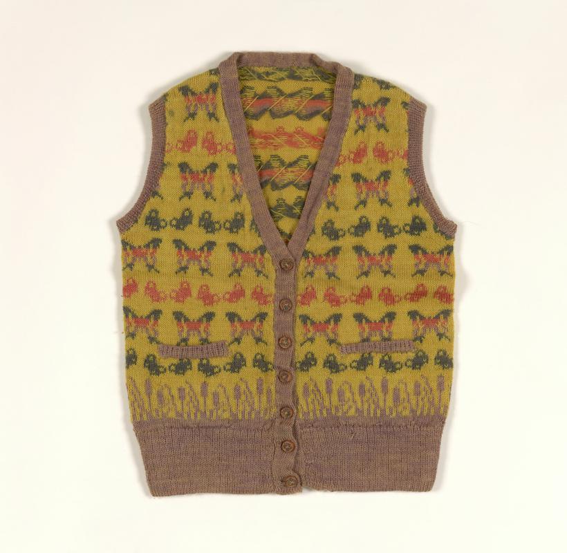 Knitted sweater, multi-coloured geometrical pattern at neck and shoulders. Rows of multi-coloured diamond shapes on front, back and sleeves on dark grey ground. No label on this sweater.