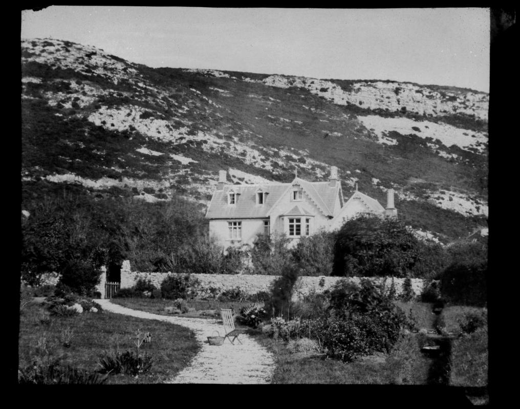 Unwaxed calotype negative with no tabs at corners. Unidentified wooded scene, with long low wall.