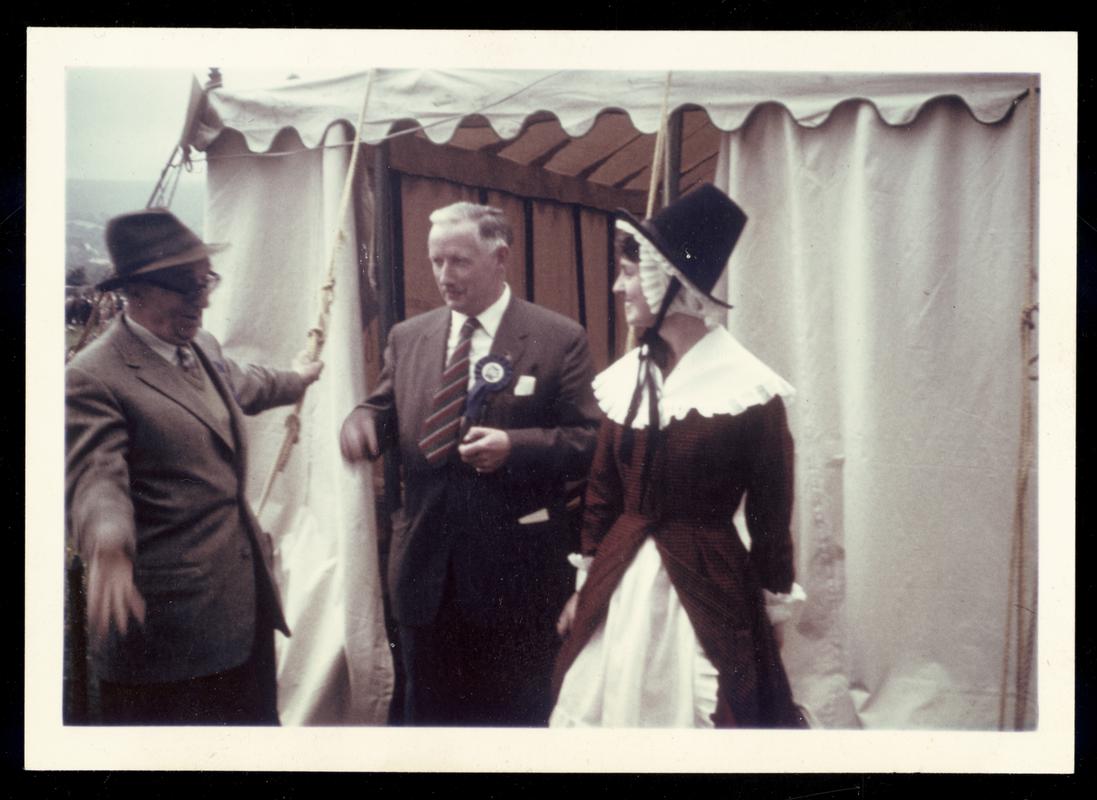 Digital copy of a photograph of Miss Gwenda Davies wearing a Welsh costume, standing next to a member of Deudraeth Brass Band. She was the Welsh Tourist and Holidays Board's 'Hostess for Wales' for the summer of 1960.