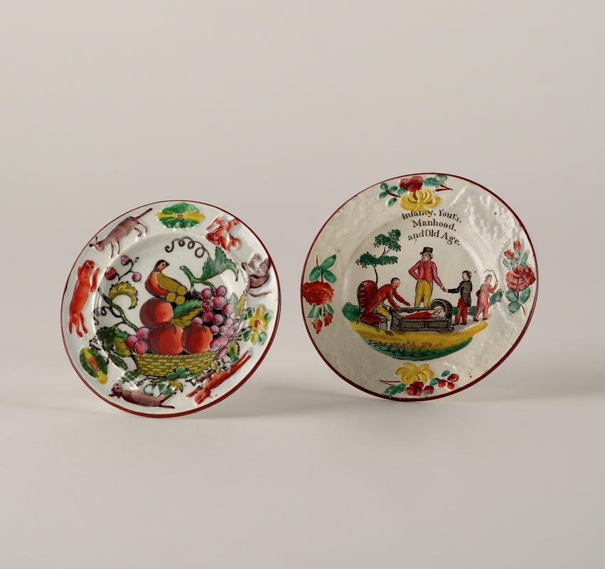 Miniature plate, earthenware, circular shape with inset base, curving sides and spreading rim, the rim moulded with embossed floral sprigs enclosed by foliate swags interspersed with ribbon-tied floral garlands; transfer-printed in black and overpainted in red, pink, yellow, green and black with to the centre of the well a spreading spray of flowers and foliage, the moulded floral sprigs to the rim overpainted in red, yellow, green and brown, a brown edge to the rim.