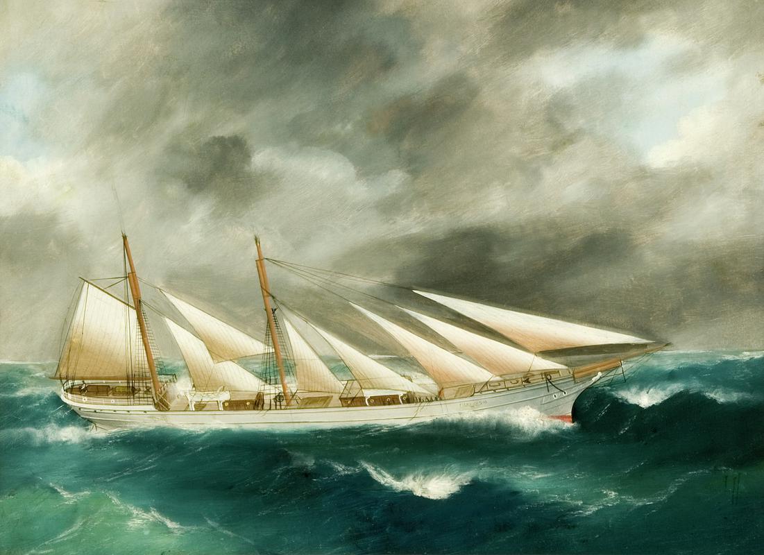 Portrait of 3-masted barque CHURCHSTON, with mountains in background. Unsigned and undated. Framed and glazed.