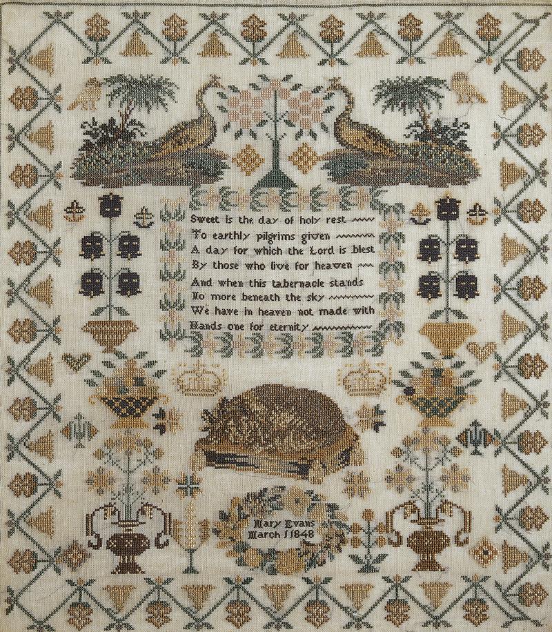 Blue silk ribbon with a piece of canvas paper stitched to it. The canvas is embroidered with an anchor motif & the inscription 'Hope of the soul'.
