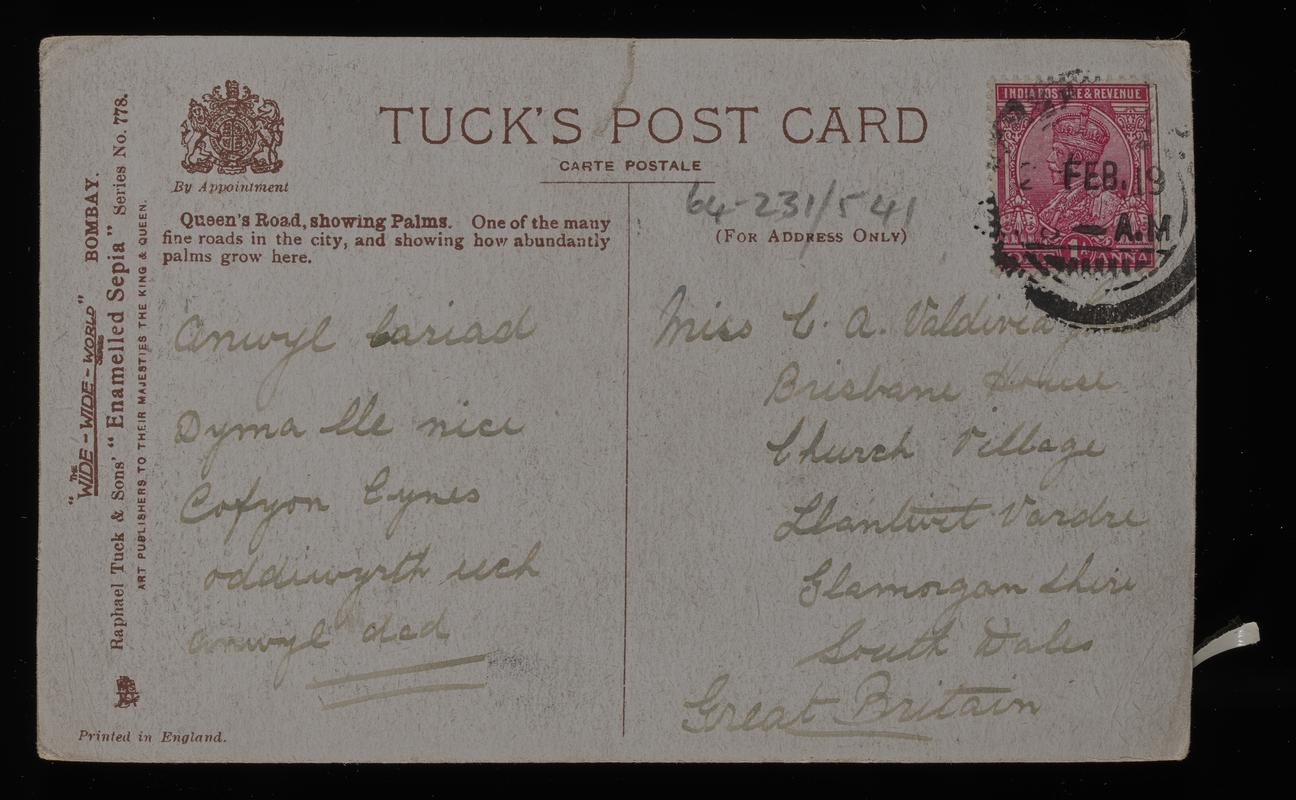 Colour postcard of "Cardiff, St. Mary Street". Sent to Nurse Davies of Merthyr Tydfil. Postmarked 21 September 1904.