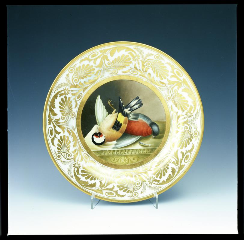 Plate, porcelain, circular, footring; bat printed in different colour examples of a gladiator on a horse attacking a gladiator lying on the ground.