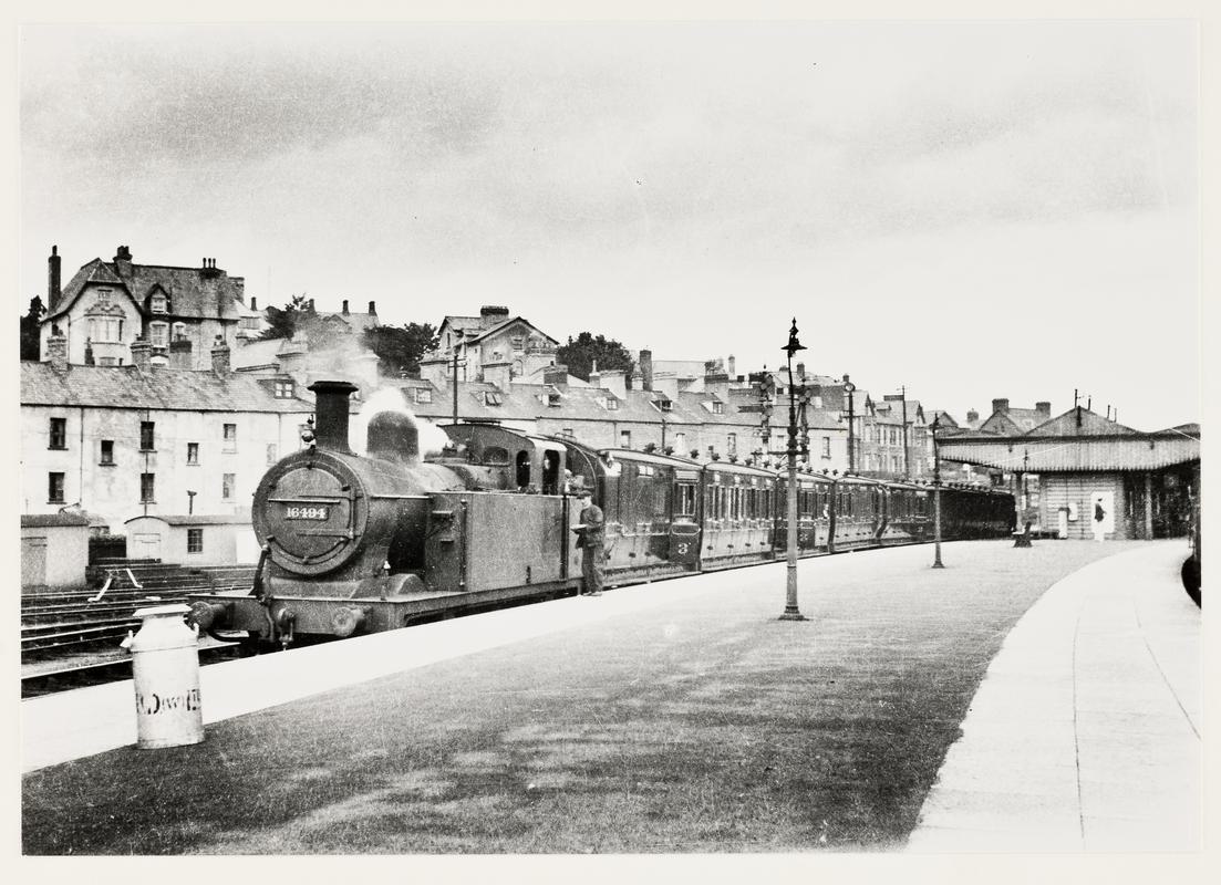 Two sepia photographs mounted onto cream card, one on each side. Front: T.V.R. Cardiff Queen Street Station, 1886 Reverse: Ships on the River Usk.