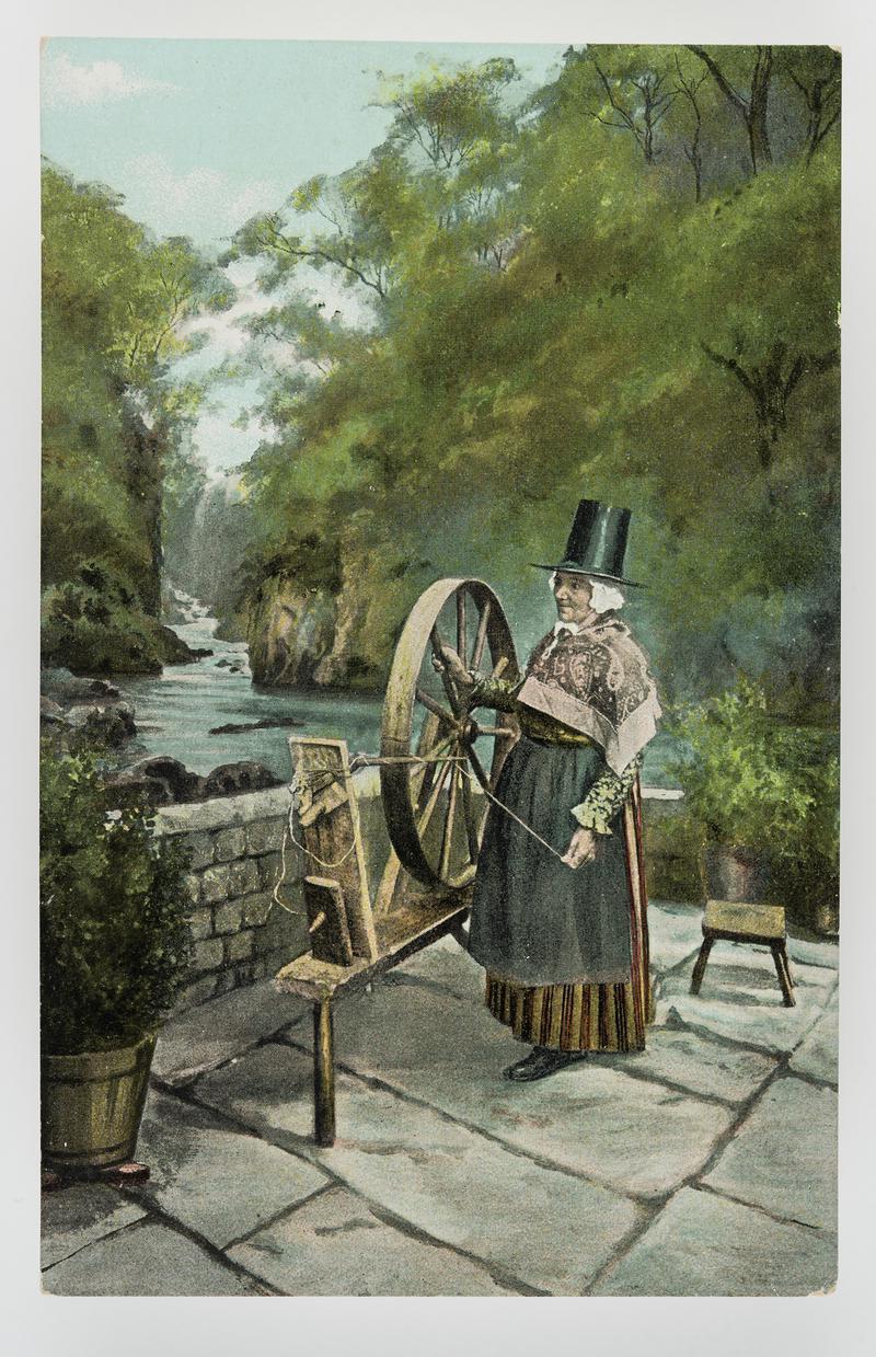 Black and white postcard of Ellen Lloyd (Betws-y-Coed), in Welsh costume standing by a spinning wheel. Unused.