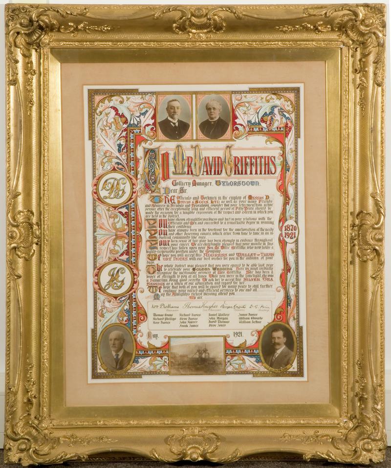 Illuminated address presented to Mr F.D. Llewelyn, Agent for the Naval Collieries, Penygraig, by officials and workmen, July 1914. Gouache and ink with inset photograph. Framed and glazed.