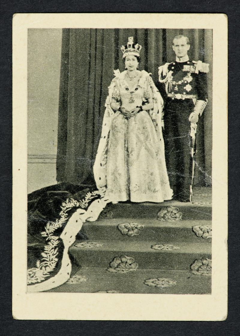 Black and white presentation card (one of a set) commemorating the coronation of Queen Elizabeth II, 1953. Issued as advertising by The Ely Brewery Co. Ltd, Cardiff. Shows Queen Elizabeth II waving after being crowned.