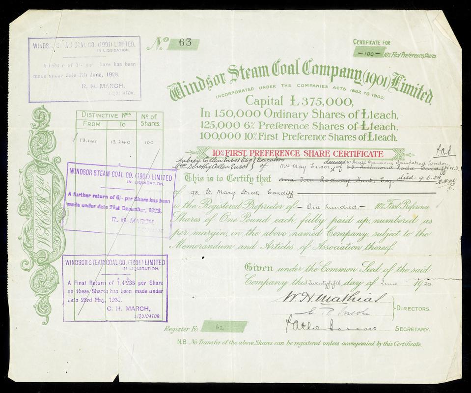 Llewellyn Shipping Company Limited, £1 ordinary shares, 1920, black on brown. * Black print on brown paper with handwritten details completed in black ink. Ornate border on left only. Embossed company seal depicting embossed company flag on lower left hand corner. 100 £1 shares numbered 357114 to 357213. Certificate number '355'. Dated 1 May 1920. 'FULLY PAID' stamped in centre. On reverse is information on the particulars of payment of calls on partly paid shares.