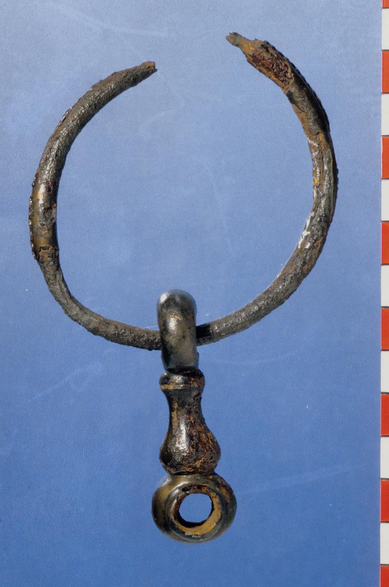 Iron rein-ring and side-link both plated with copper alloy. The rein-ring is slightly oval (external diameter 77-81mm, internal diameter 59-63m) and circular in cross-section (diameter c.9mm). Two flattened stop-studs (diameter c.14mm, height 8mm) are fixed through the ring by iron rivets. There are wear facets on the link side of both stop-studs. The portion of the ring which accommodated the side-link is also partially worn through but this was originally thinner than the main part of the rein-ring. The perforations of the segmented side-link (length 69mm, width of terminal bulb socket 17mm) are set in perpendicular planes at right angles to one another. The inner eye of the side-link has worn through.