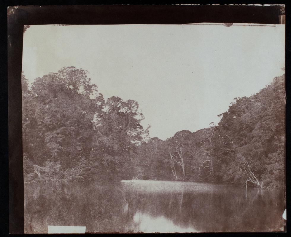 Salted paper print. Willy Llewelyn sat on the steps of the porch of Penllergare House with dog Mustard.