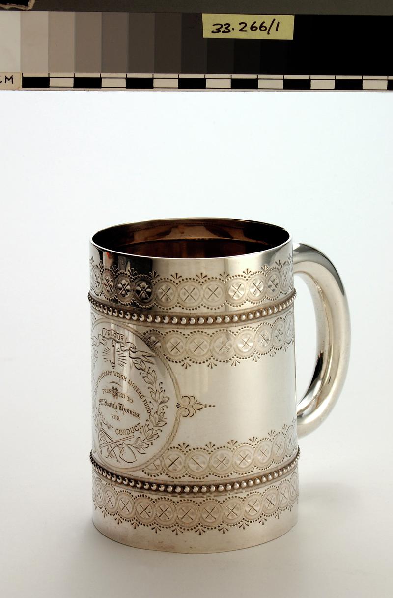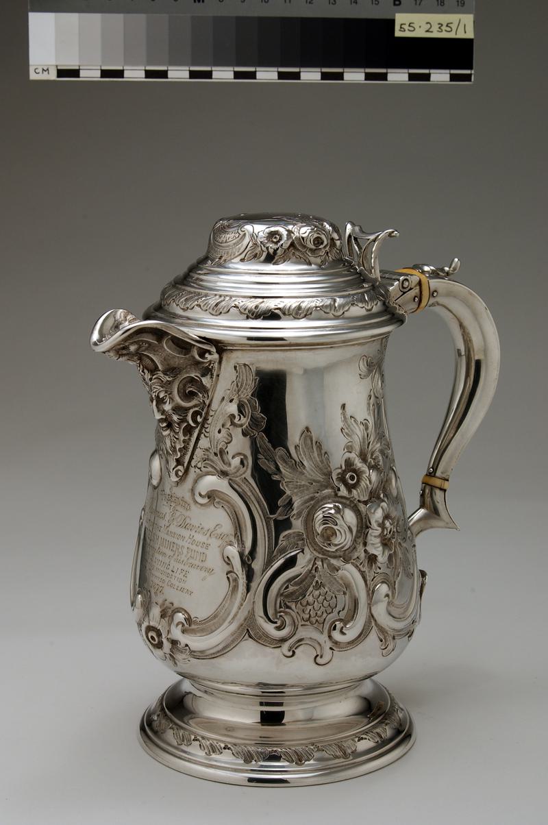 Silver ewer presented to William Davies, Manager of Coedcae Colliery, Trehafod, and was one of the rescuers at Tynewydd Colliery in 1877. Highly decorated silver ewer hallmarked and maker's mark beneath spout on front of ewer. Hallmarked London, 1876 with duty mark.