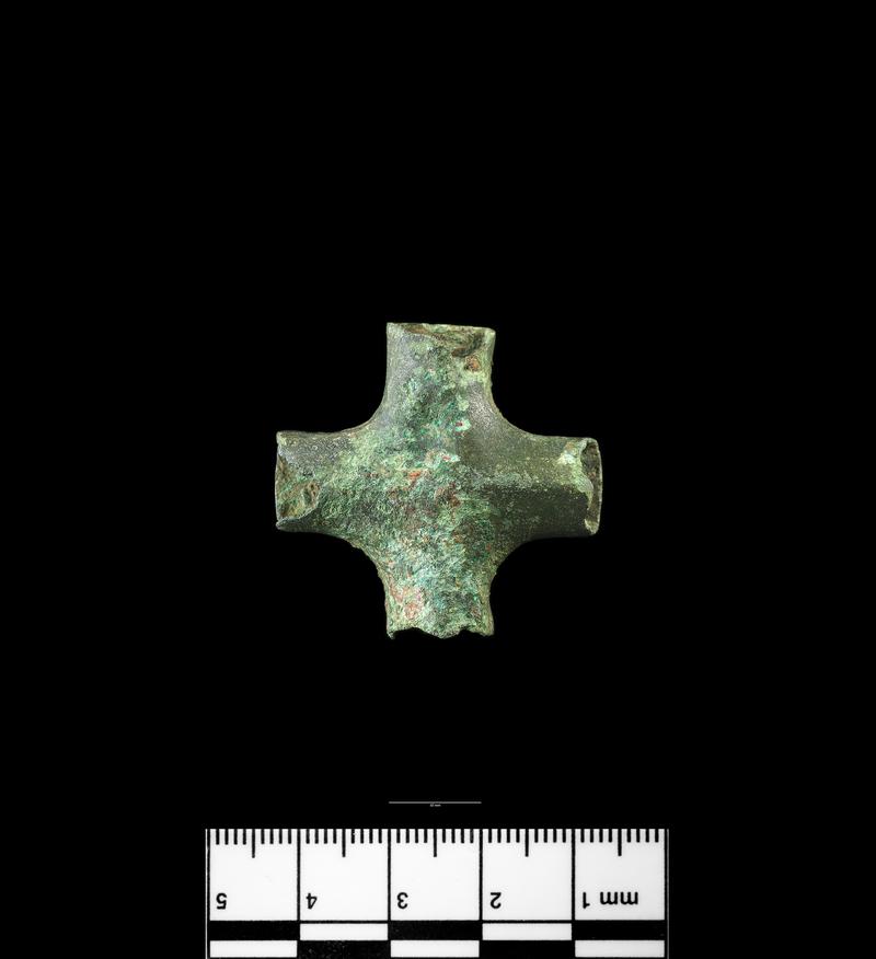 Rectangular plaque with two rivet-holes on the long axis presumably for fixing to a leather belt. The edge is bevelled and just within the bevel is a slightly irregular line of punched circles. One rivet hole contains the badly rusted remains of what appears at first sight to be a hollow iron rivot; but a tubular rivet of iron is so unlikely that it is probable that the central hole has been produced by the corrosion of the iron. Rectangular belt plaques are of this type are common in Pagan Saxon graves; but they normaly have a rivet-hole at the each corner.
