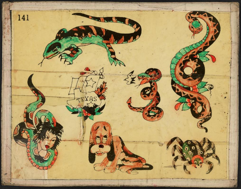 The interior has images of banners with text. It is signed, ‘JK’. The text reads, ‘These designs have been hand drawn with great care & attention. Therefore when making a choice of design, kindly respect my wishes by handling these charts with due care. Free hand artist tattooing. Any design, any subject. Crude & inartistic work expertly & artistically covered.' Contains tattoo flahes F2021.21.117.1-9