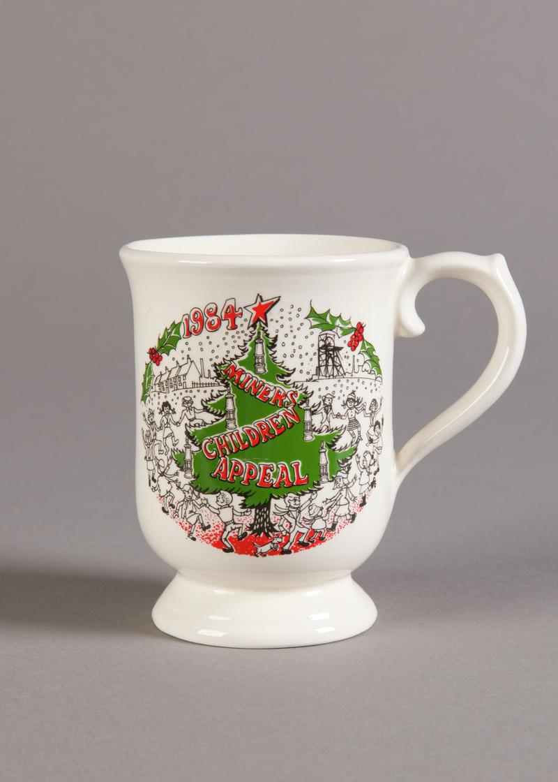 White glazed mug printed in black on front with miners lamp, head gear and a leek inside a garter with words 'Miners Struggle 1984'. Ewenny Pottery mark on bottom with number '36' written in silver.