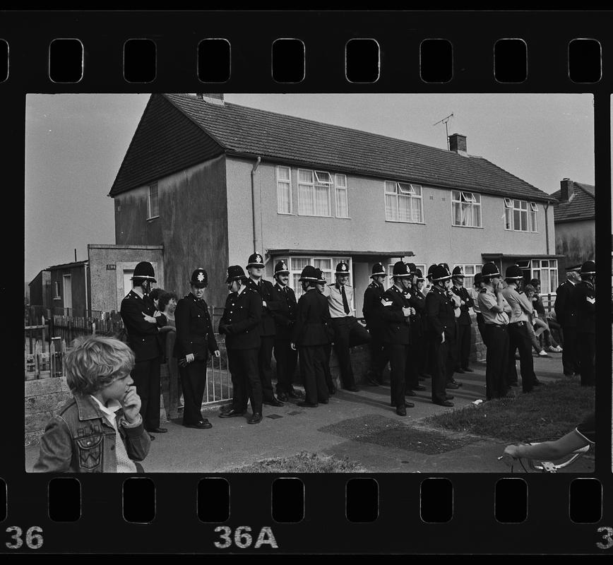 Digital copy of a photograph showing striking miners occupying the National Coal Board offices in Tondu, near Bridgend, July 1984.
