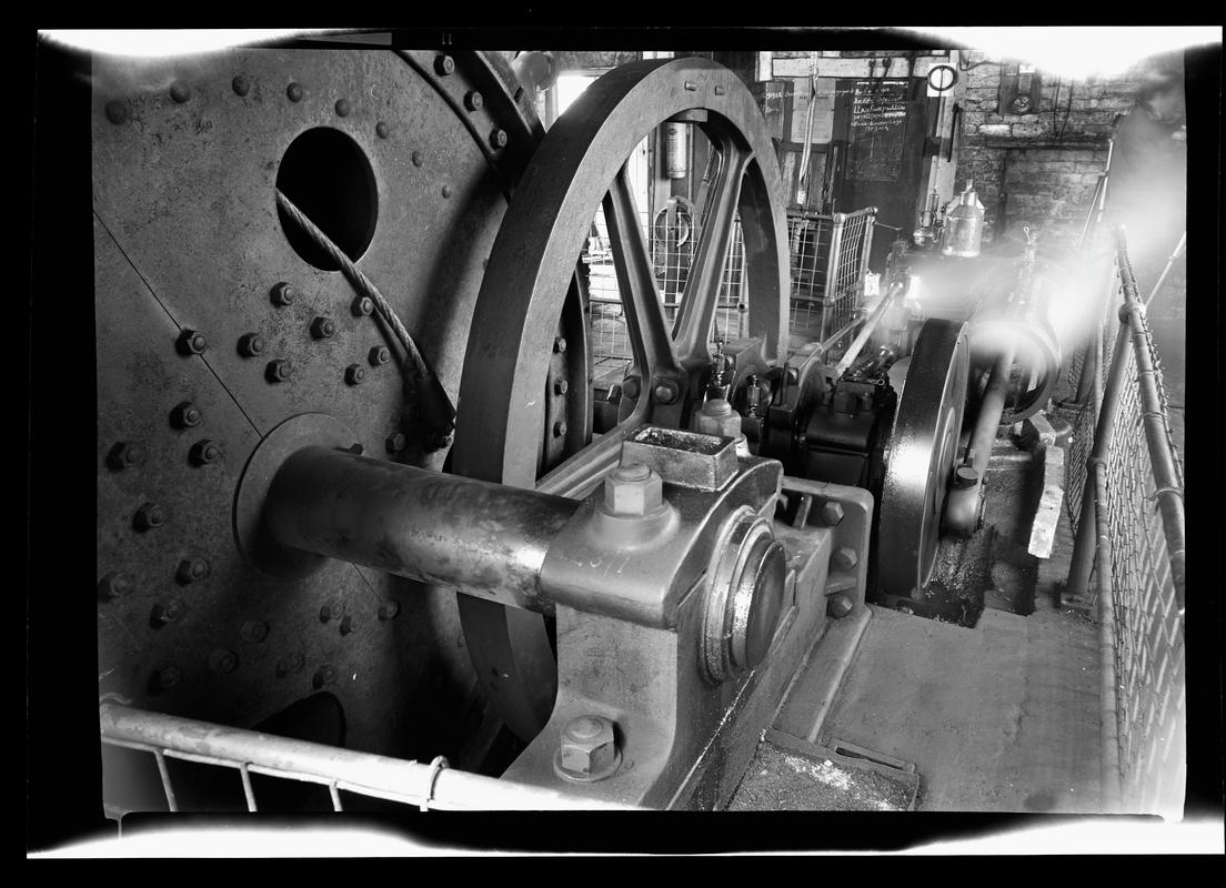 Black and white film negative showing an underground roadway and conveyor, Treforgan Colliery.