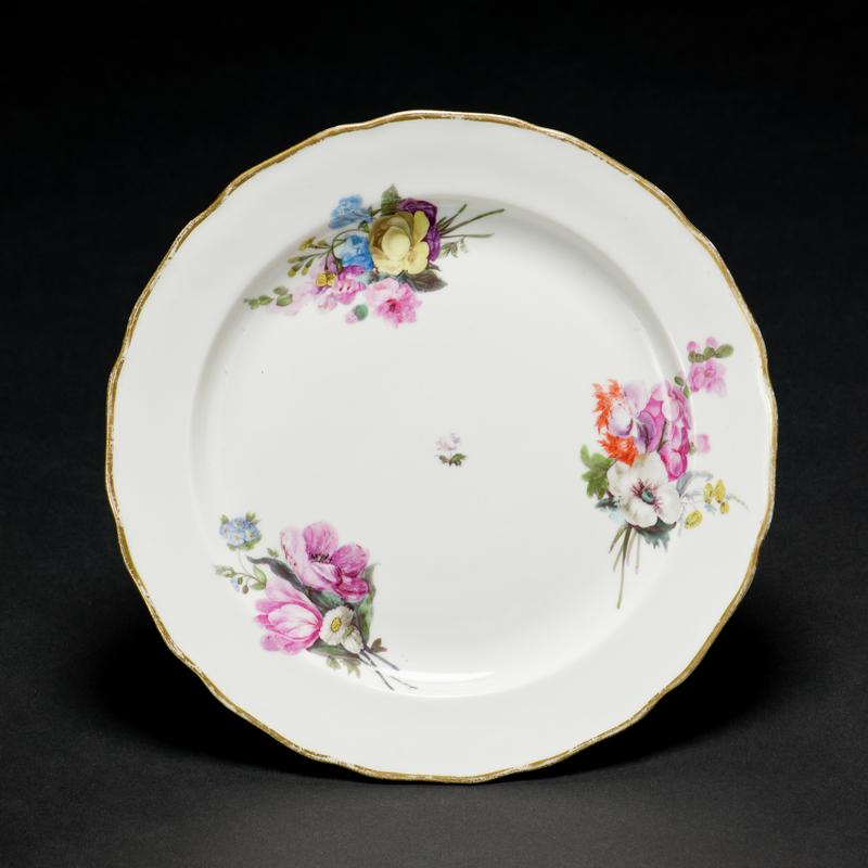Ice pail, soft paste porcelain, wheel thrown, conventional straight sided form curving to an applied waisted base, moulded and applied handles below the rim each in the form of scrolls supporting a shell. Body painted in enamels with naturalistic groups and sprays of fruit and flowers: a larger group centrally placed on each side, one including grapes, roses and plums, the other grapes, roses, plums and berries; small groups under handles, one including pears and apples and flowers, the other pears gooseberries and flowers; single scattered sprays including acorns, roses and berries. Deep wave band around rim of turquoise enamel, each wave containing an gilded cornucopia of flowers and leaves, further gilding in bands around foot, on moulded handles and at rim.