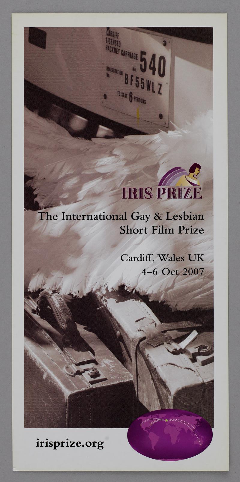 Bilingual (Welsh/English) leaflet advertising the Iris Prize LGBTQ+ Film Festival 2022. Given out at Pride Cymru, Cardiff, Saturday 26 August 2022. Collected to show the range of free promotional and advocacy material available at Pride events.