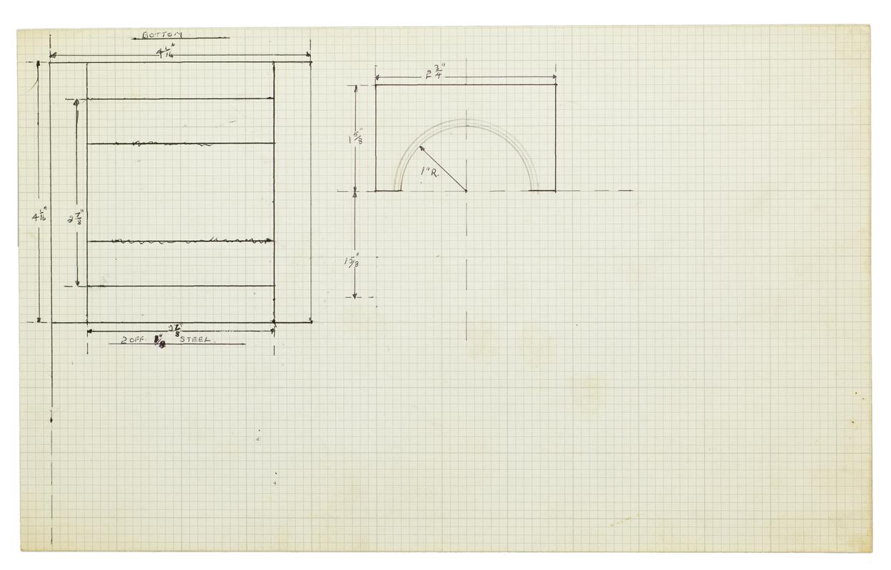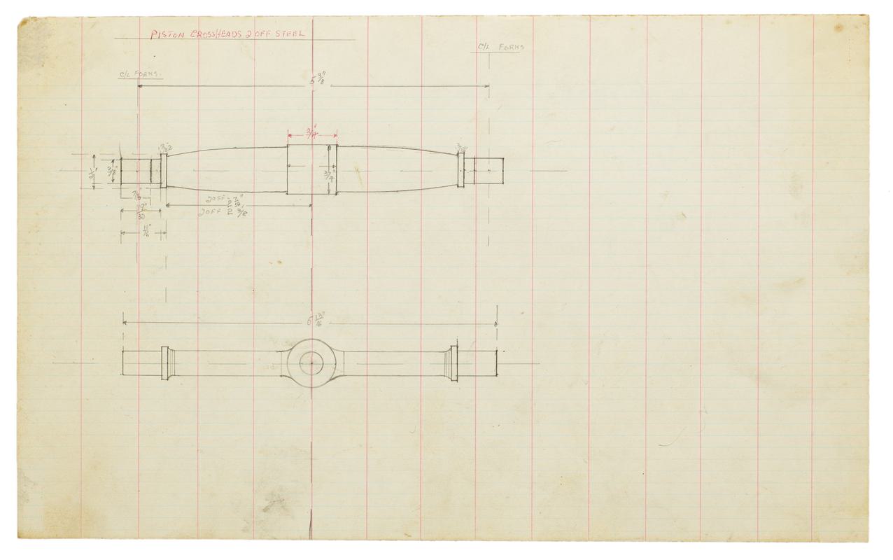 Original technical drawings by Mr Cole for the construction of the side lever paddle engine model (80.78I). Pencil and blue biro on lined graph paper.
