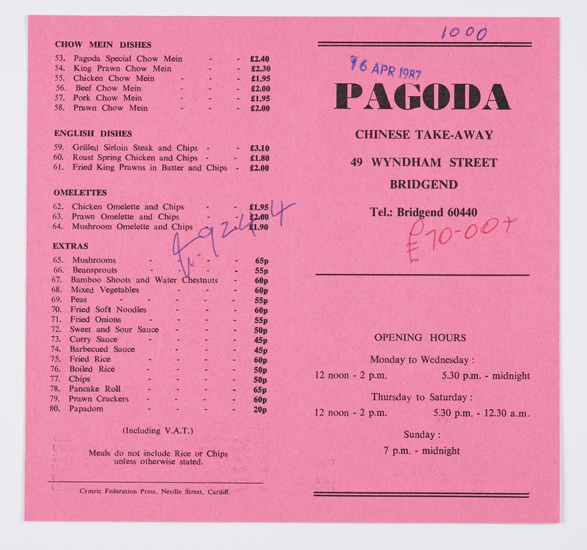 Bill printed for 'The Eurasian Restaurant', an Indian restaurant in Canton. Handwritten order details on the front. Stamped with date 7 July 1987.