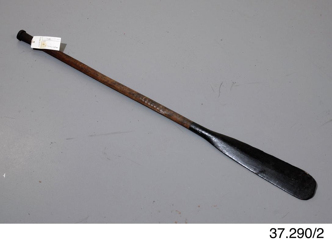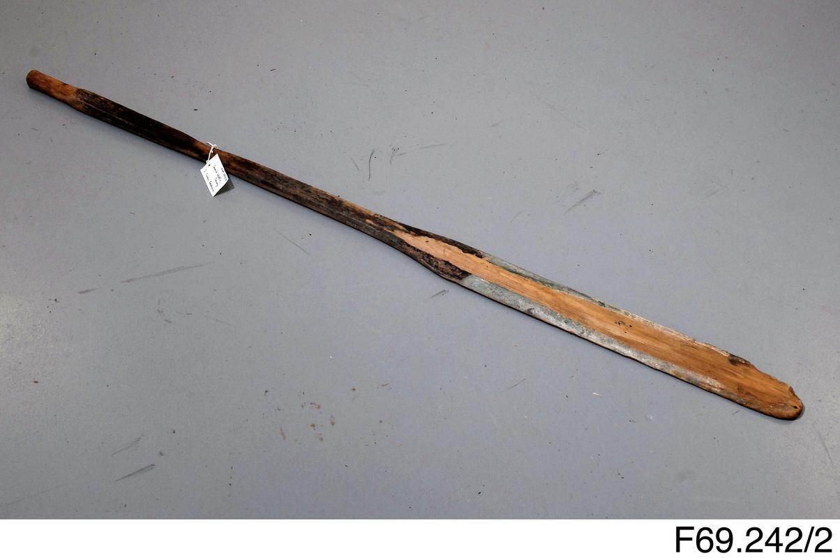 model of a Teifi coracle paddle, flattened top pf paddle ends in claw