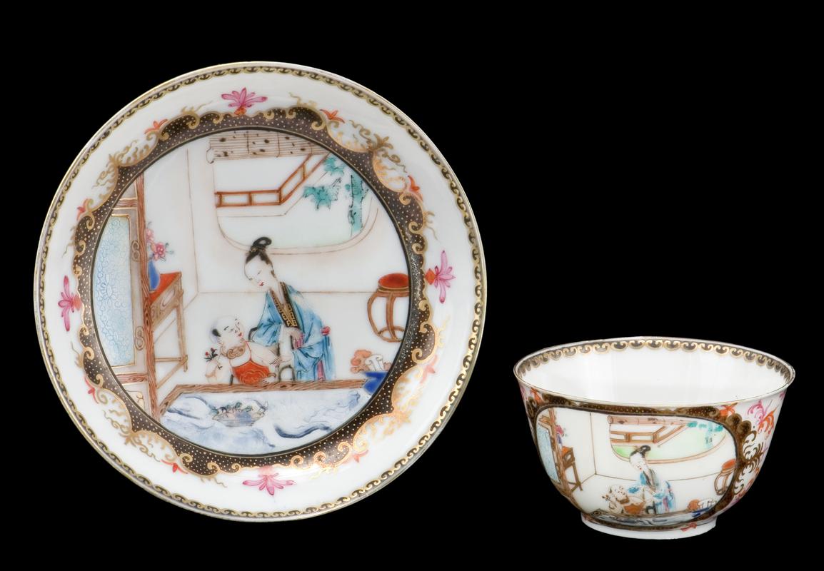 Tea bowl and saucer, hard-paste porcelain, the saucer dish shaped and without a well, the saucer and tea bowl with foot rings and slightly out-turned rims; the saucer painted with a central Flemish winter scene closely copying a 1730s Meissen design, featuring numerous figures in winter dress in a landscape with a group of trees and a windmill to the left, two churches to the centre background and two vernacular buildings to the right background, this scene is within an infilled gilt Laub und Bandelwerk cartouche, surrounded by scrolls in puce and red enamel and, at the centre-bottom, drapery in puce, a complex gilt Laub und Bandelwerk border beneath the rim and a plain band of gilt at the rim, the underside of the saucer is decorated with two groups of Japanese-style flowers in puce, red, yellow and green enamel, between which are flying insects in the same colours, the tea bowl is decorated in a similar scheme, with two Flemish winter scenes, one a smaller version of that on the saucer and the other a harbour scene, the interior of the tea bowl is painted with a small harbour scene in puce.