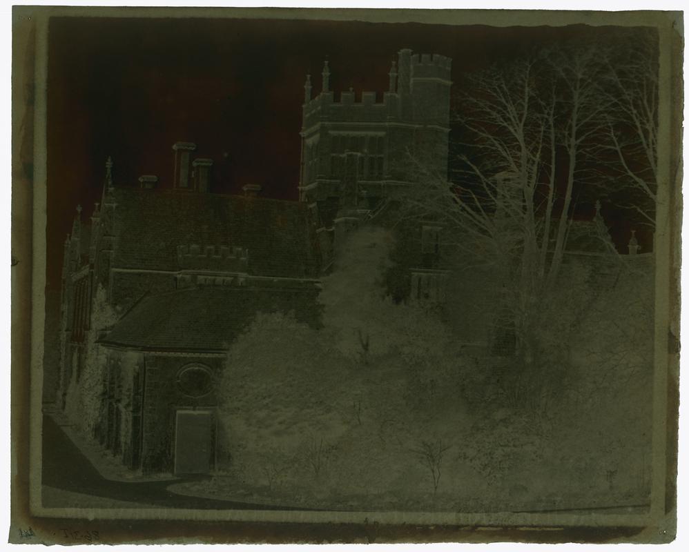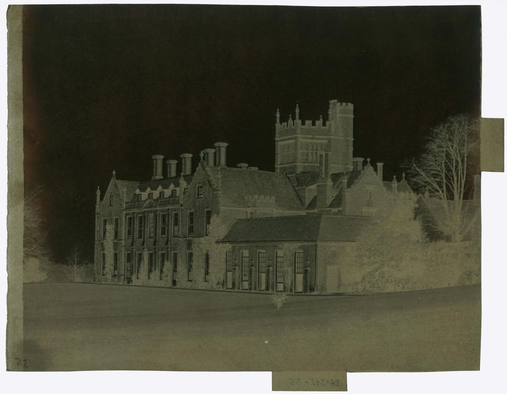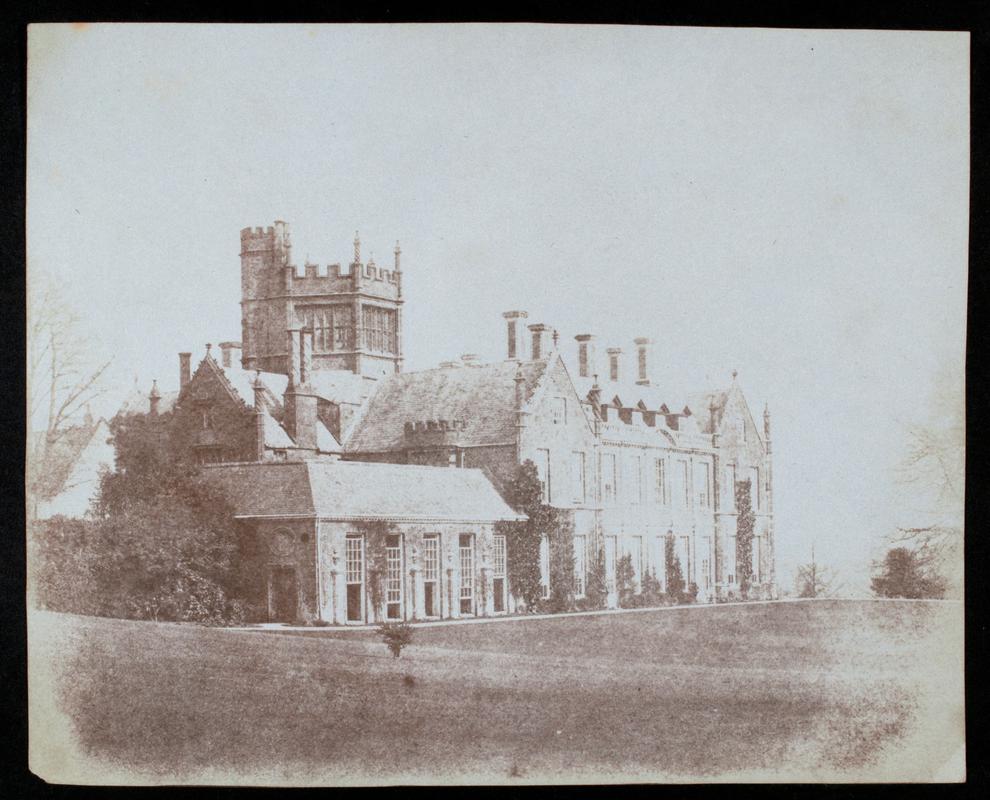 Salted paper print, from Calotype paper negative, showing Melbury House from across a lake.