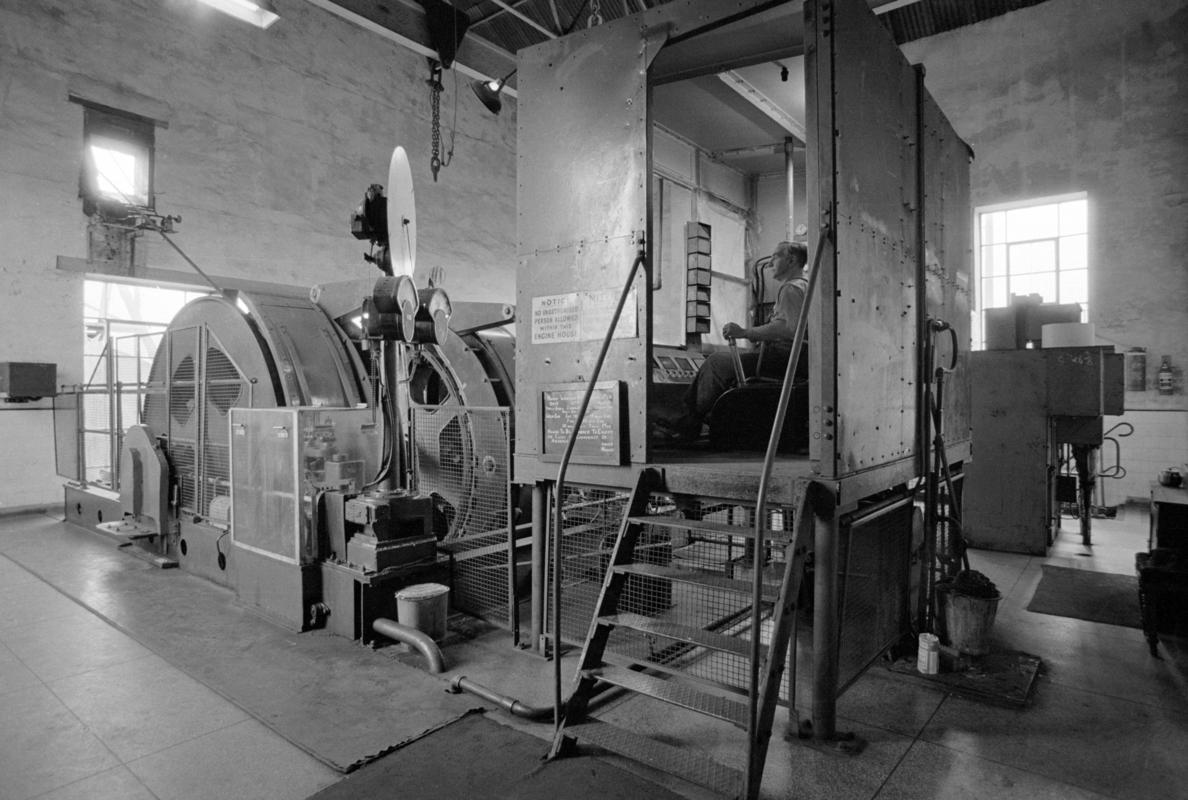 Sarah Greene filming a feature for Blue Peter inside winding engine house, Big Pit, early 1980s.
