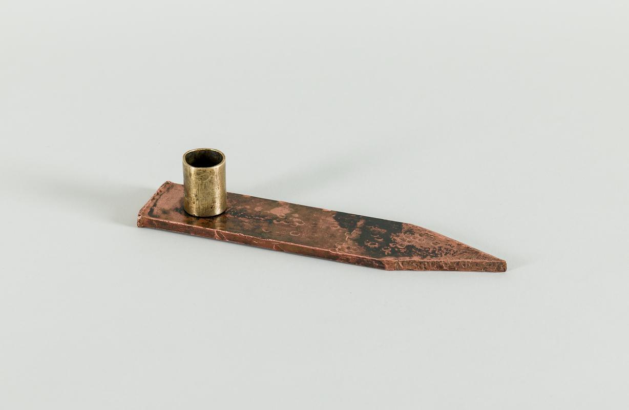 Metal triple stem candle holder. It was found near the entrance of Tylchfach Drift Mine Nantmelyn Tonyrefail, 1986. The tapered end would have been driven into a roof support timber to provide a fixed light at the workplace.
