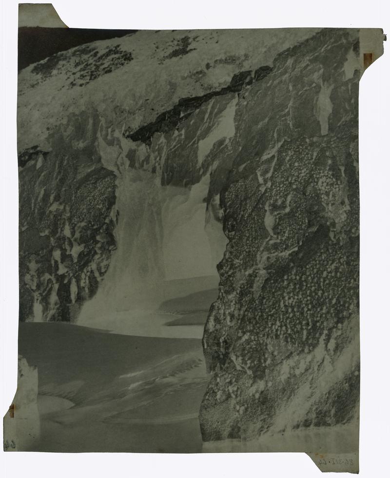 Collodion glass negative showing female figure (probably a relative of John Dillwyn Llewelyn) standing in Three Cliffs Bay. Cliffs in background with rock pool in foreground.