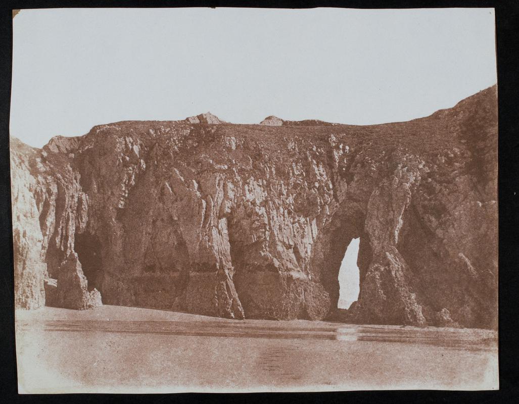 Mounted salted paper print, from Calotype paper negative. Coastal scene showing Kynance Cove and the Lizard Point, Cornwall, with rocks in foreground and rocky promontories in the distance.