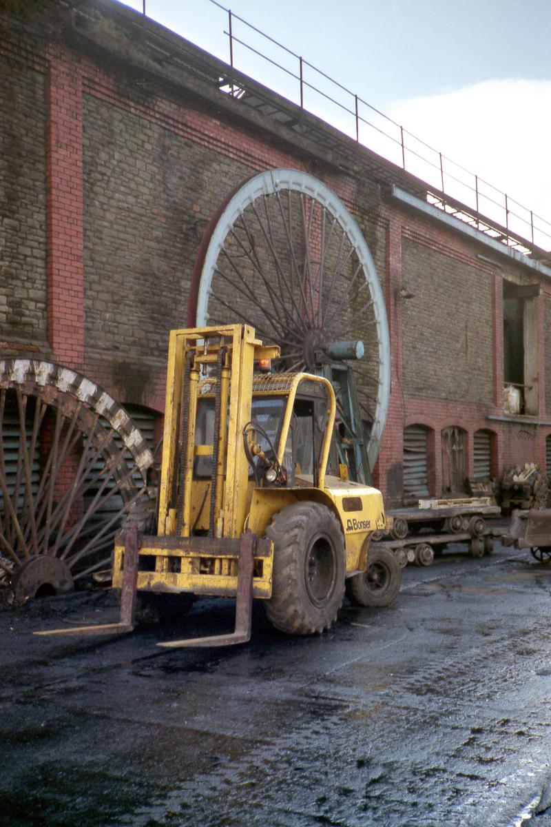 Colour film negative showing a locomotive passing through Oakdale Colliery, 16 April 1981. 'Oakdale 16/4/81' is transcribed from original negative bag.