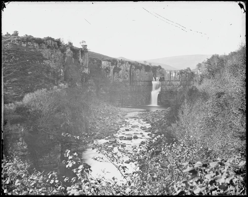 Collodion glass negative showing a very rocky River Tees above High Force, Teesdale. Sky has been painted black.