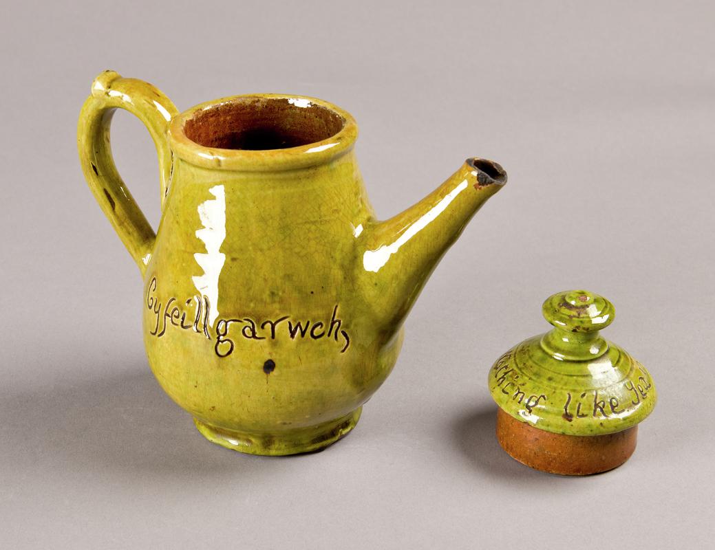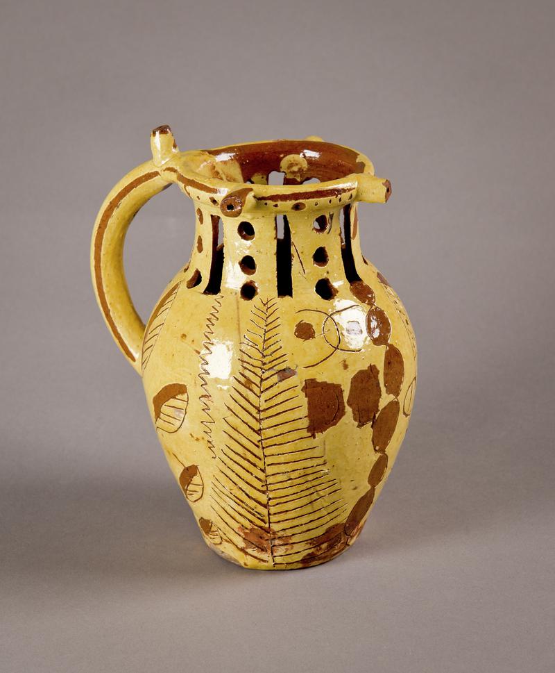 Mug surmounted by circular shallow bowl, with drainage hole, and with wide-mouthed opening in front; covered with white slip and blotchy dull-yellow glaze; undecorated; single handle at back; sgraffito inscription.