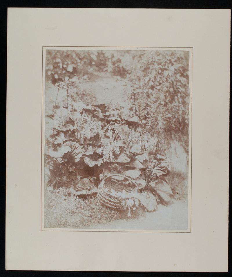 Waxed calotype negative no tabs. Ivy covered tree with iron railings at Penllergare.
