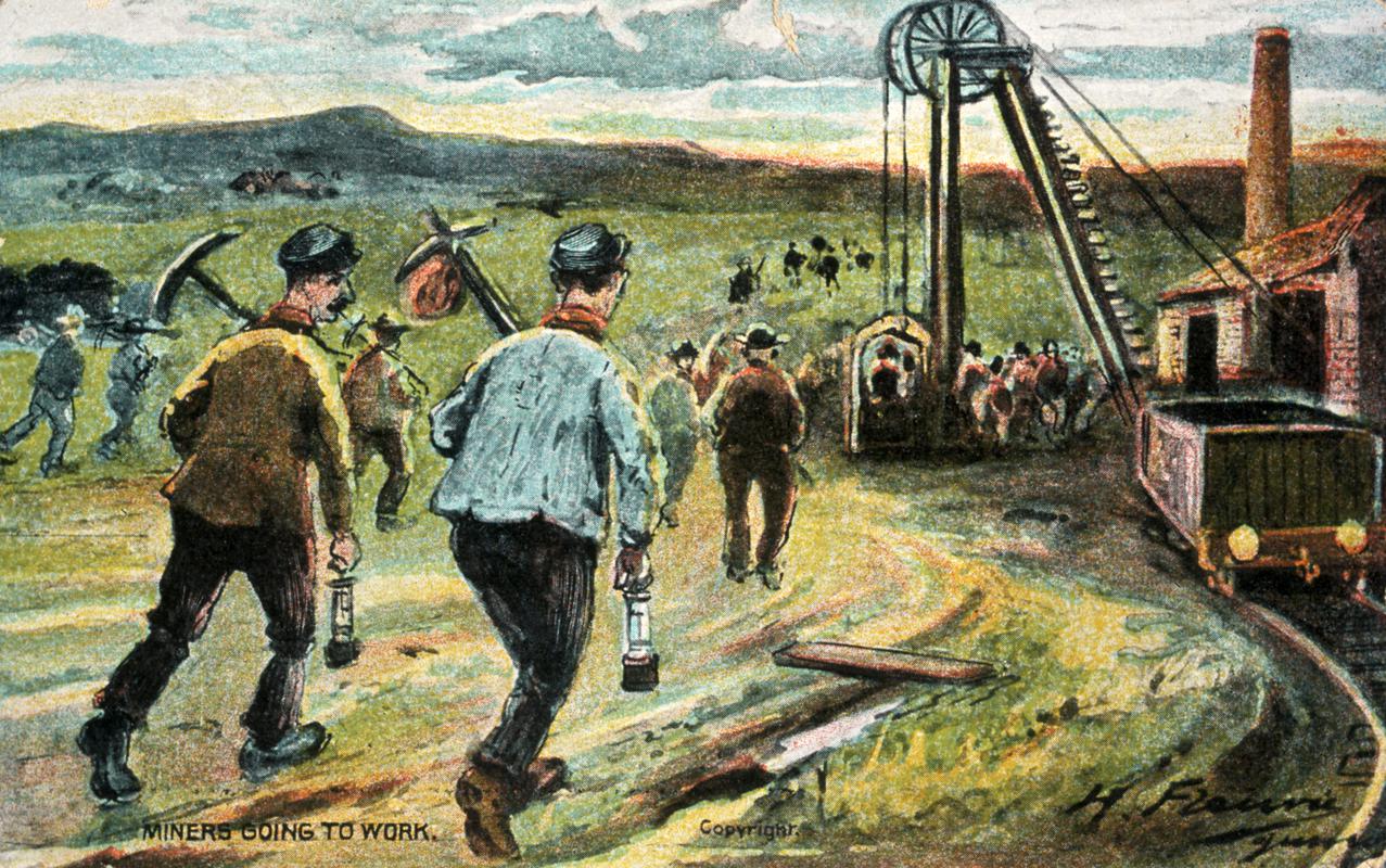Postcard from The Star Series. Colour drawing showing a loaded coal train heading to the docks with miners loading drams to the right. Unused, but message has been written.