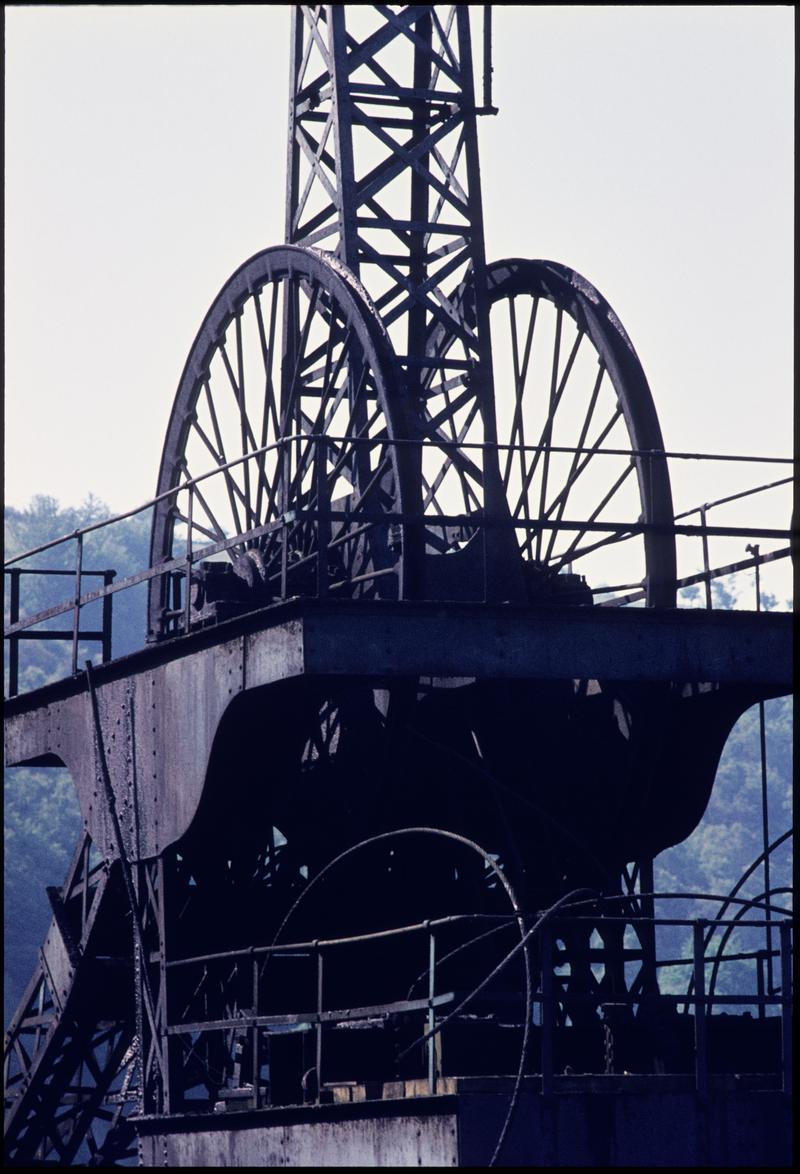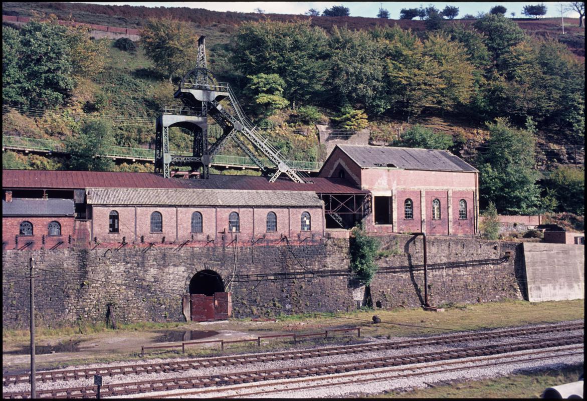 Colour film slide showing the upcast and downcast shaft headframes, Nantgarw Colliery.