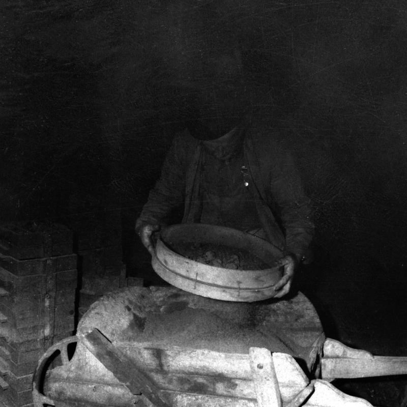 Workers at Dinorwic slate quarry. Frame 12 on contact sheet with 11 photographs (originally 12, one has been cut off) showing pattern making moulding at Dinorwic slate quarry.